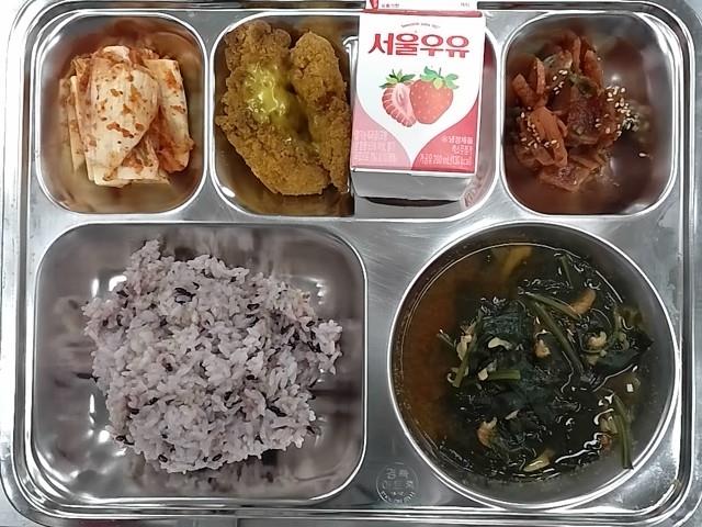 석식 : 기장흑미밥,조갯살시금치된장국,핫크리스피치킨텐더+소스,오복채무침,배추김치,딸기우유