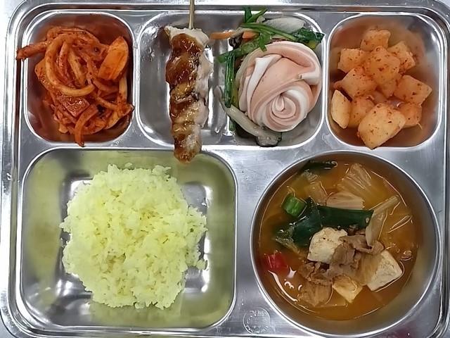 중식 : 강황밥,돈육김치찌개,고추잡채/백년초꽃빵,도라지사과무침,깍두기,양념 닭꼬치