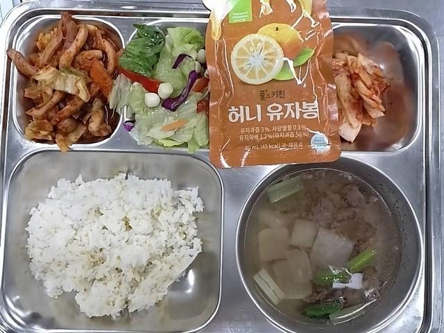 조식 : 찰기장밥,쇠고기무국,오징어쭈꾸미야채볶음,양상추치즈참깨샐러드,배추김치,핫 유자봉 주스