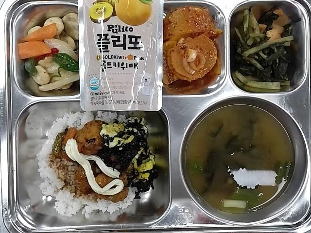 석식 : 치킨마요덮밥,미역미소시루국,우엉어묵채소볶음,단무지무침,열무김치,골드키위배주스