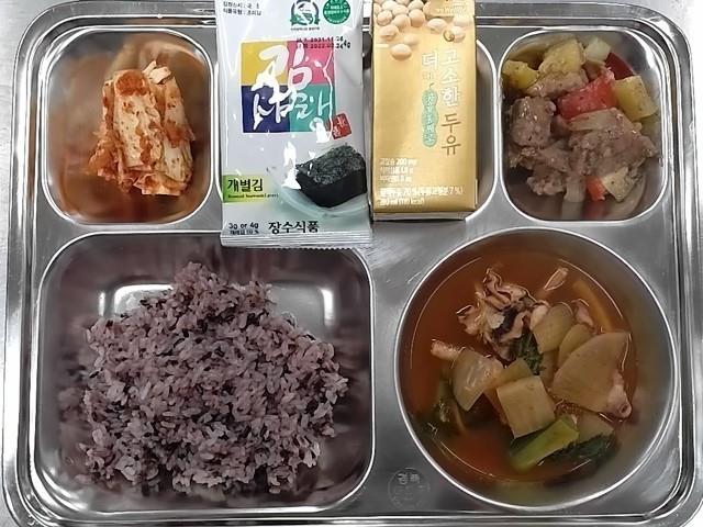 조식 : 찰흑미밥,오징어무국,찹스테이크야채볶음,김구이,배추김치,두유