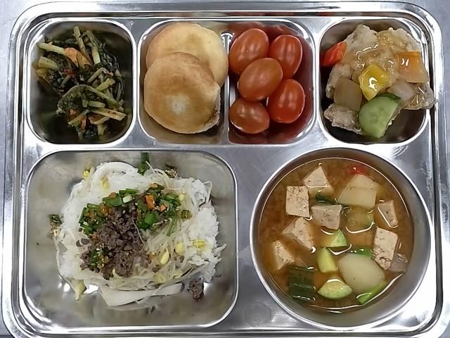 중식 : 콩나물밥+양념장,두부된장국,찹쌀꿔바로우+소스,열무김치,수제씨앗호떡,방울토마토