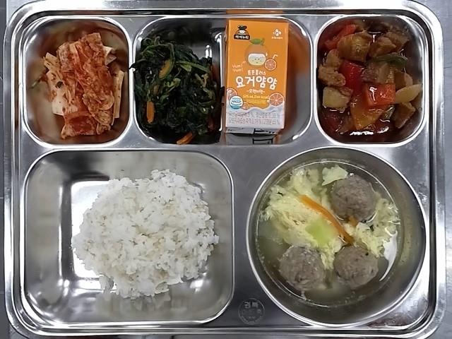 조식 : 현미찹쌀밥,굴림만둣국,큐브덕찹스테이크볶음,시금치고추장무침,배추김치,오렌지주스