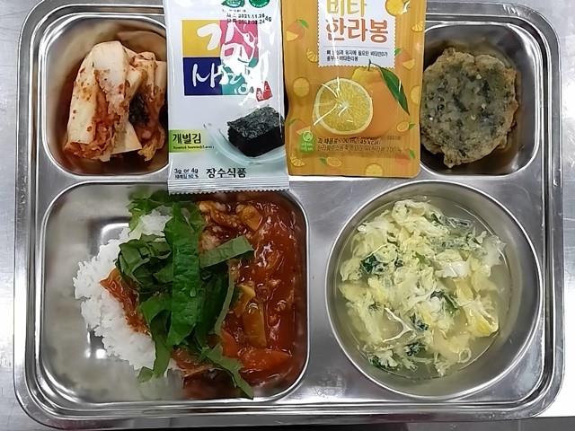 석식 : 낙지오징어비빕밥,부추계란국,쫀득참나물전,김구이,배추김치,한라봉주스