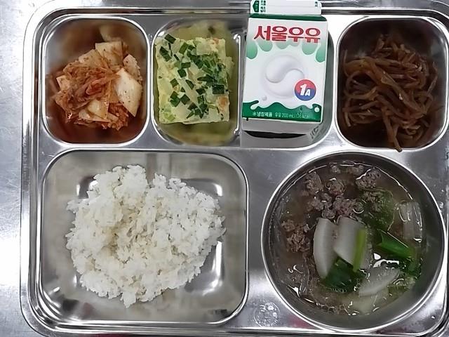 조식 : 현미찹쌀밥,쇠고기당면국,야채계란찜,우엉채조림,배추김치,흰우유