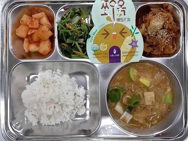 중식 : 보리밥,청국장찌개,앞다리살제육볶음,유채나물,깍두기,배도라지음료
