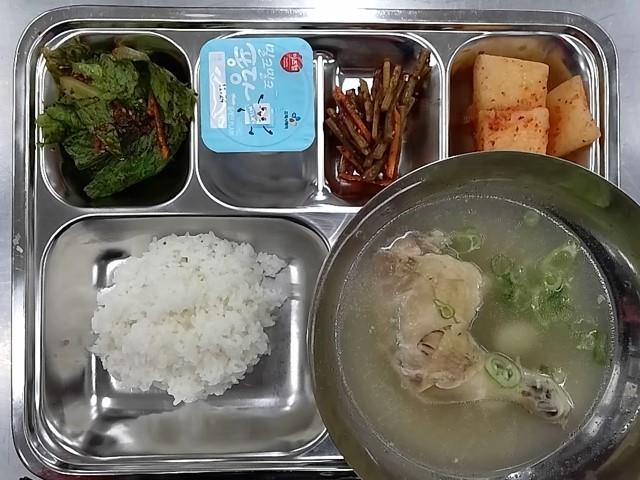 중식 : 백미찹쌀밥,통다리삼계탕,마늘쫑장아찌,상추겉절이,석박지,플레인 요거트