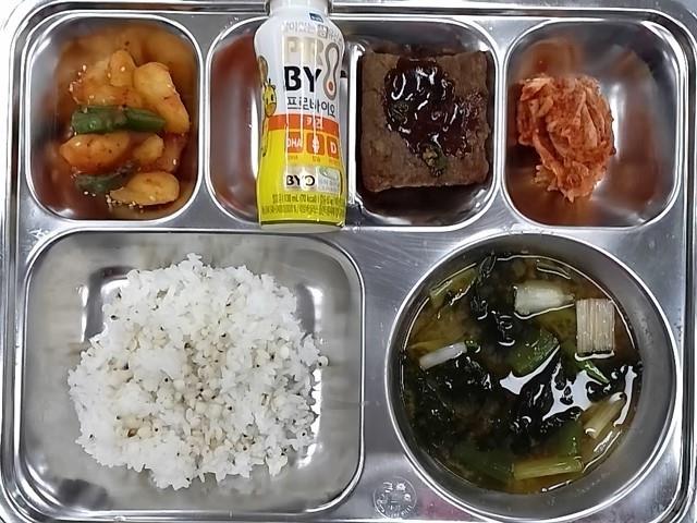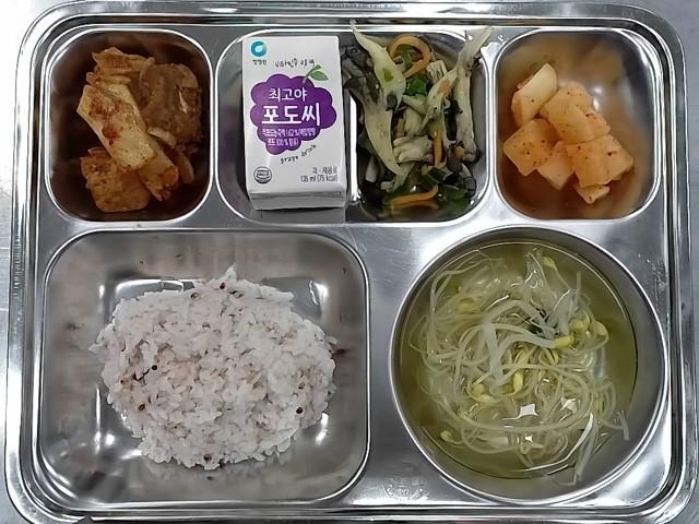 석식 : 수수밥,무콩나물국,등갈비김치찜,느타리버섯피망볶음,깍두기,포도주스