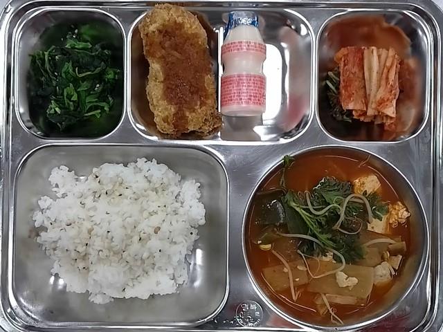 석식 : 율무밥,동태찌개,빵꽃돈까스+소스,시금치나물,배추김치,요구르트