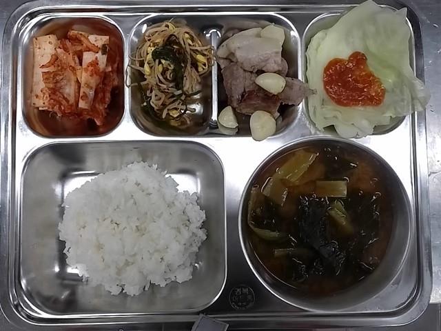 중식 : 백미밥,근대된장국,돈삼겹목살구이,콩나물파채겉절이,양배추찜+쌈장,보쌈김치