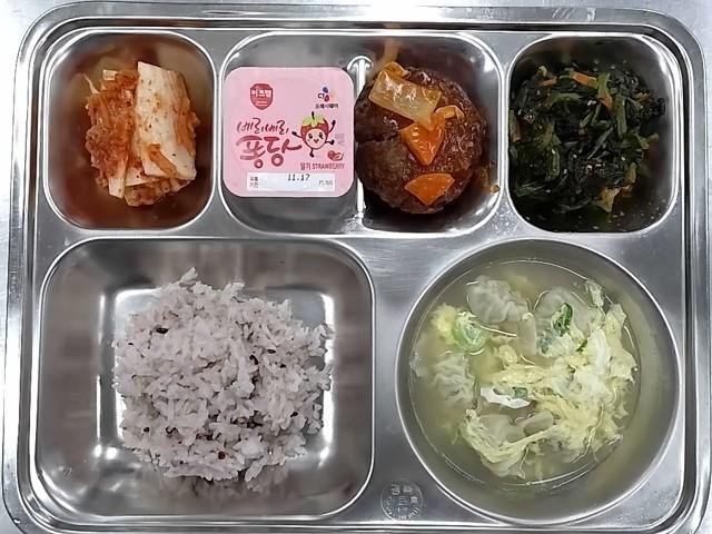 조식 :혼합잡곡밥,달걀만둣국,함박스테이크+소스,시금치고추장무침,배추김치,요플레