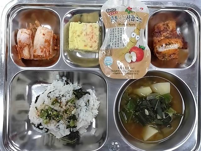 중식 : 곤드레밥/부추양념장,감자아욱국,매콤순살코다리조림,맛살계란찜,배추김치,홍삼사과주스