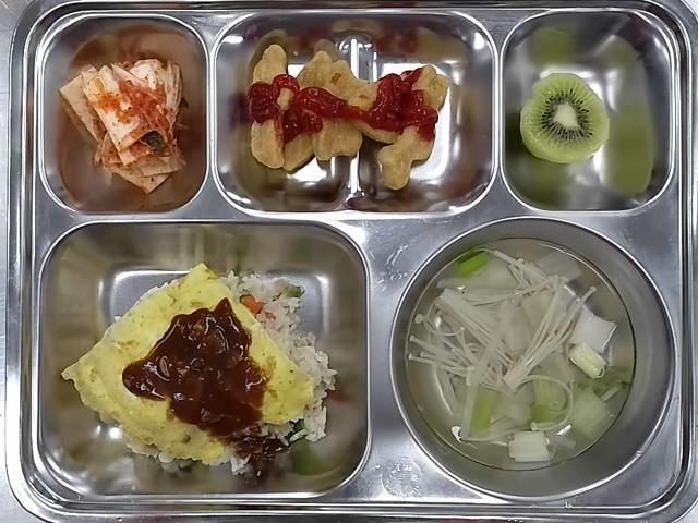 석식 : 오므라이스(하이스소스),팽이버섯맑은국,치킨너겟+케찹,배추김치,키위