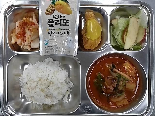 조식 : 찰보리밥,오징어무국,케이준치킨텐더+머스타드소스,양상추사과무침,배추김치,망고주스