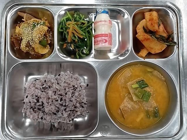 중식 : 흑미밥,콩비지찌개,오리고추장불고기,유채나물,총각김치,요구르트