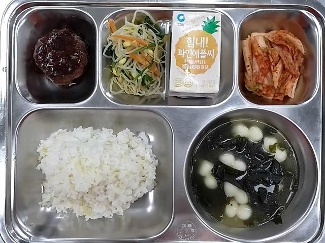 석식 : 찰기장밥,조랭이떡미역국,쥬시햄벅스테이크+소스,콩나물부추무침,파인애플c음료