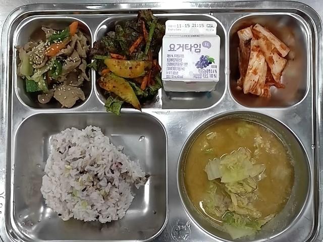 조식 : 혼합10곡밥,콩가루배추국,매실청돈육불고기,상추오이무침,배추김치,요거타임