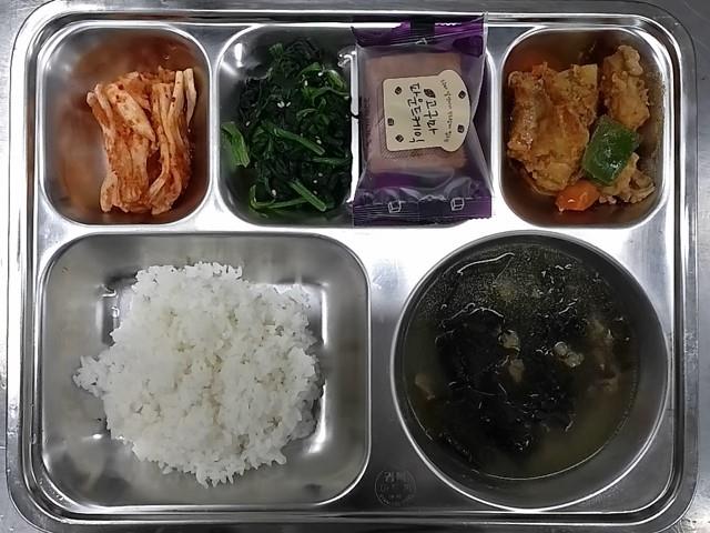 중식 : 백미밥,쇠고기미역국,닭볶음탕,시금치나물,배추김치,조각케이크