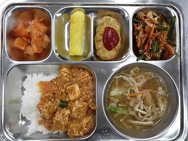 석식 : 마파두부덮밥,유부우동국,계란에그랑땡+케찹,양배추야채무침,깍두기,파인애플