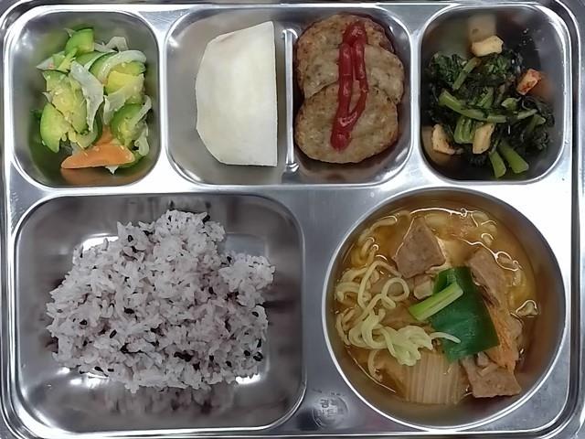 중식 : 찰흑미밥,부대찌개+라면사리,육원전+케찹,호박새우젓나물,열무김치,친환경 배
