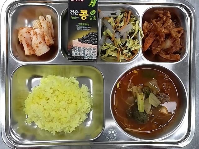 석식 : 강황밥,쇠고기우거지국,오징어야채볶음,청포묵김가루무침,배추김치,검은콩두유