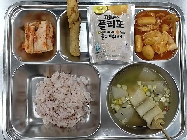 석식 : 차수수밥,꼬치어묵국,오징어튀김,국물떡볶이,배추김치,골드키위배주스