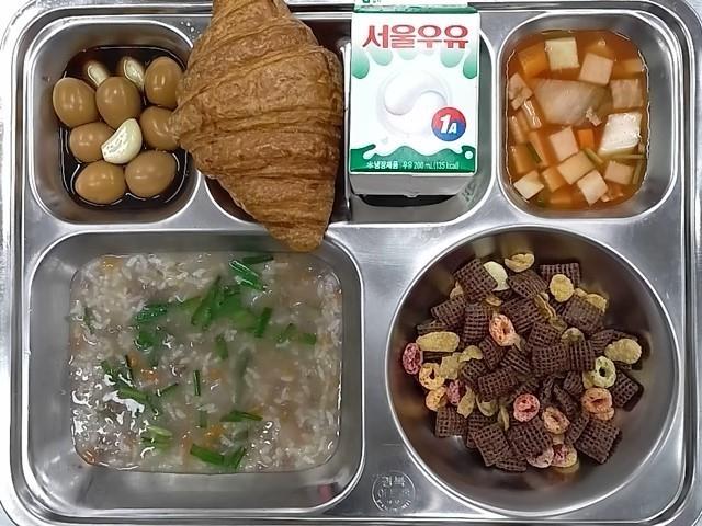 조식 : 갈릭크로와상,소고기야채죽,나박김치,메추리날조림,시리얼+우유