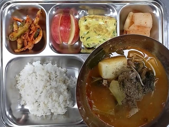 중식 : 찰보리밥,감자등뼈해장국,햄계란말이,오이도라지무침,친환경 사과