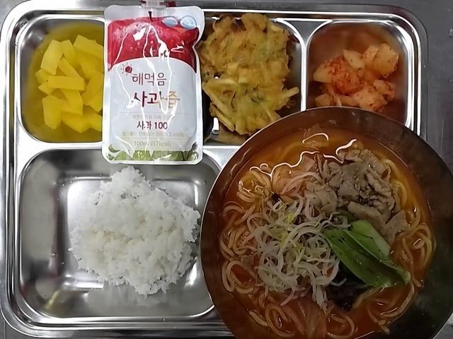 중식 : 고기짬뽕+숙주고명,쌀밥(추가),모듬야채튀김,레몬 스틱단무지,깍두기,유기농 사과주스