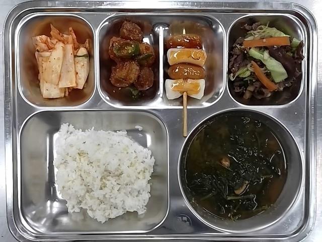 조식 : 찰보리밥,시금치된장국,소불고기야채볶음,미트볼까스+소스,배추김치,소떡소떡