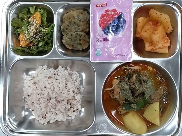 석식 : 차수수밥,감자등뼈해장국,깻잎육원전,치커리사과무침,석박지,탱큐베리주스