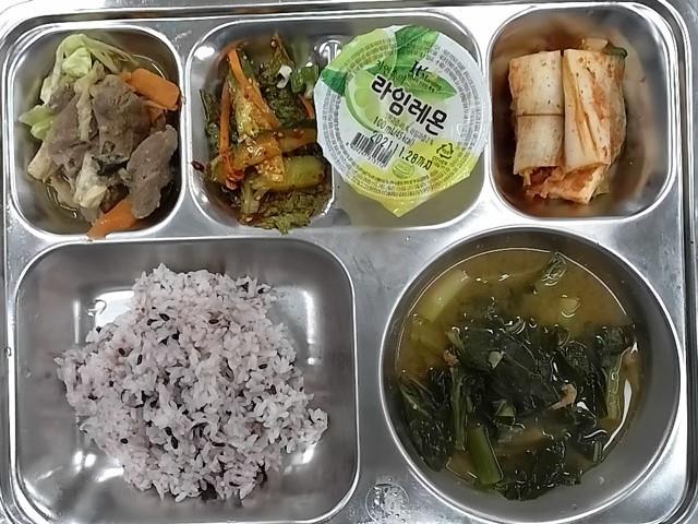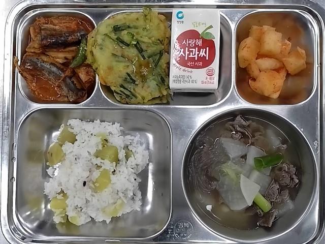 중식 : 고구마밥,쇠고기당면국,꽁치김치찜,애호박부침+초간장.깍두기,사랑해 사과c주스