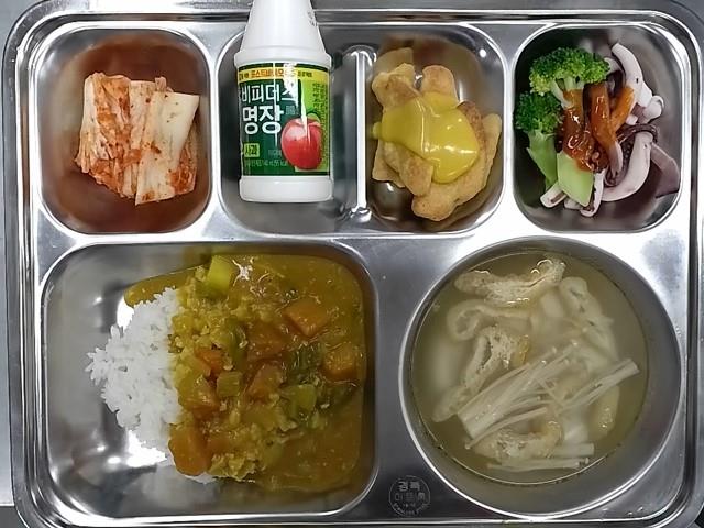 석식 : 단호박카레라이스,팽이버섯맑은국,오징어브로콜리숙회+초장,달콤치킨너겟+소스,배추김치,비피더스