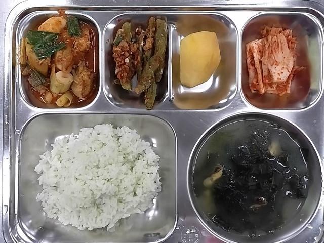 중식 : 클로렐라밥,홍합미역국,닭볶음탕,꽈리고추찜+양념장,배추김치,단감