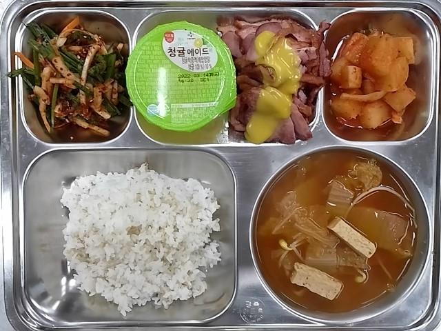 중식 : 보리밥,김치콩나물국,오리훈제+소스,양파부추겉절이,깍두기,청귤에이드