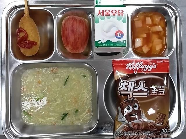 조식 : 전복영양닭죽,나박김치,모짜렐라핫도그+케찹,초코시리얼+우유,친환경사과