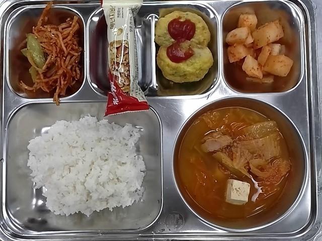 조식 : 백미밥,참치김치찌개,계란동그랑땡+케찹,오이진미채무침,깍두기,크런치넛트에너지바
