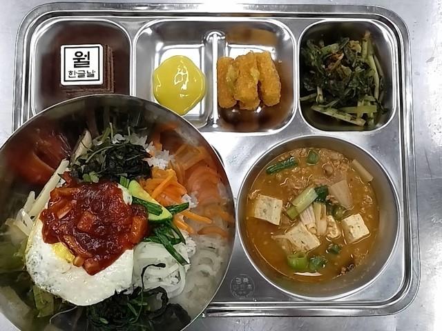 중식 : 산채비빔밥/약고추장,청국장찌개,계란후라이,크리스피두부스틱+소스.열무김치,한글케이크