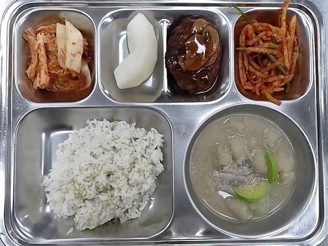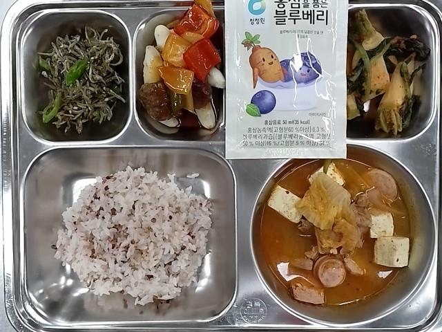 석식 : 차수수밥,부대찌개,갈비맛야채떡쌈,멸치풋고추볶음,총각김치,홍삼품은 블루베리 음료