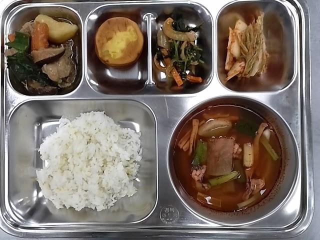 석식 : 찰기장밥,오징어무국,안동찜닭,참나물고추장무침,배추김치,고구마타르트