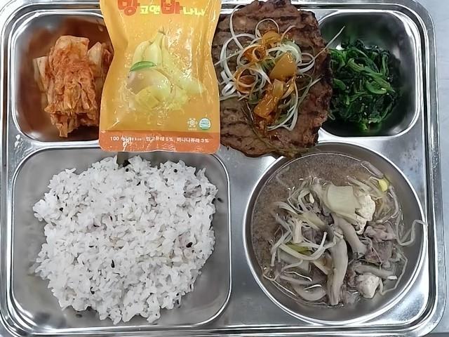 조식 : 혼합잡곡밥,버섯샤브샤브국,매콤언양식바짝불고기+파채,시금치나물,배추김치,망고 앤 바나나음료