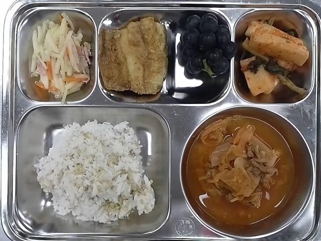 중식 : 보리밥,김치짜글이,삼치카레구이,감자채베이컨볶음,총각김치,포도