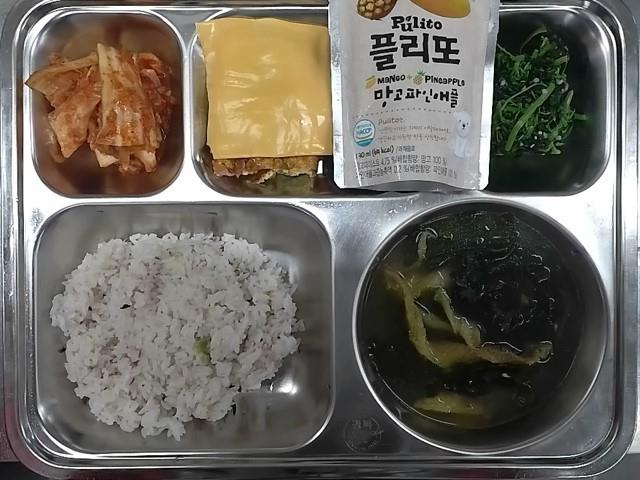 조식 : 혼합잡곡밥,북어채미역국,치즈계란파이,비름나물,배추김치,망고주스