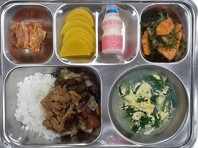 석식 : 숯불고기짜장밥,계란부추국,단무지,치커리사과무침,배추김치,유산균음료