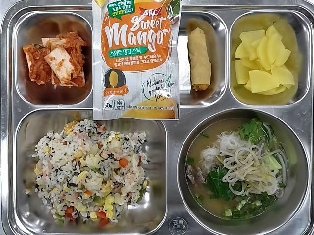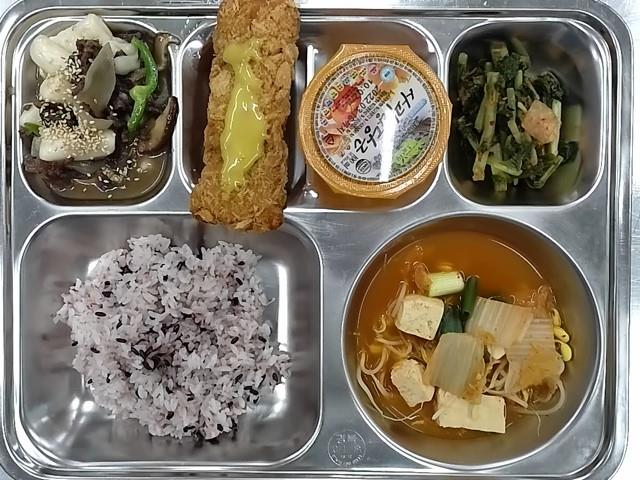 석식 : 찰흑미밥,김치콩나물국,궁중떡볶이,피자치즈롤까스+소스,열무김치,캐플주스