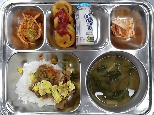석식 : 목살큐브스테이크덮밥,근대된장국,스마일 감자튀김+케찹,도라지오이무침,배추김치,엔요 요구르트