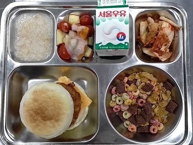 조식 : 에그토르티아맥모닝,숭늉,감말랭이 과일샐러드,시리얼+우유,배추김치