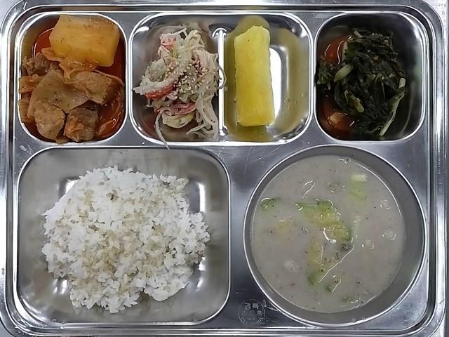 중식 : 찰보리밥,들깨수제비국,묵은지갈비찜,숙주맛살무침,열무김치,파인애플
