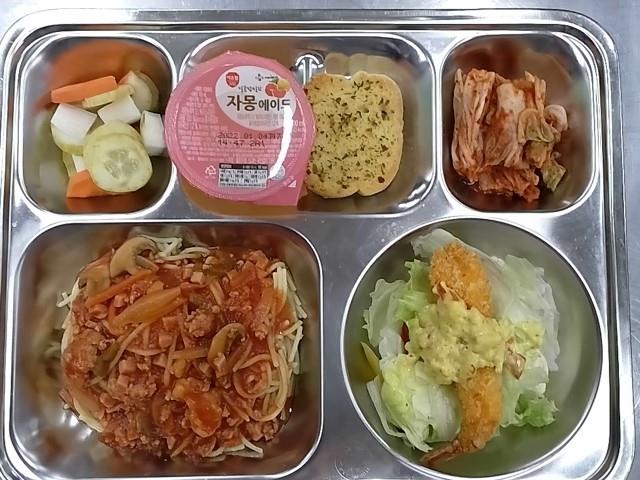 중식 : 토마토소스스파게티,새우후리타샐러드,마늘빵,야채피클,배추김치,자몽에이드
