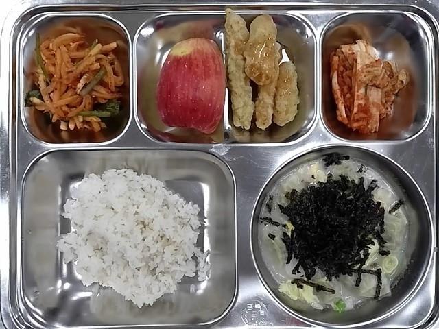 조식 : 보리밥,떡만두국,파슬리꿔바로우+소스,무미나리생채,배추김치,친환경사과